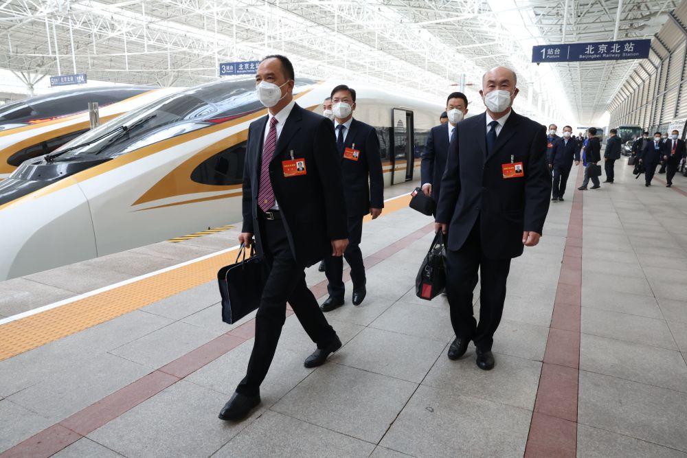 10月13日,来自内蒙古自治区的党的二十大代表乘高铁抵达北京北站。这是当日首个抵京的京外代表团。新华社记者 张玉薇 摄