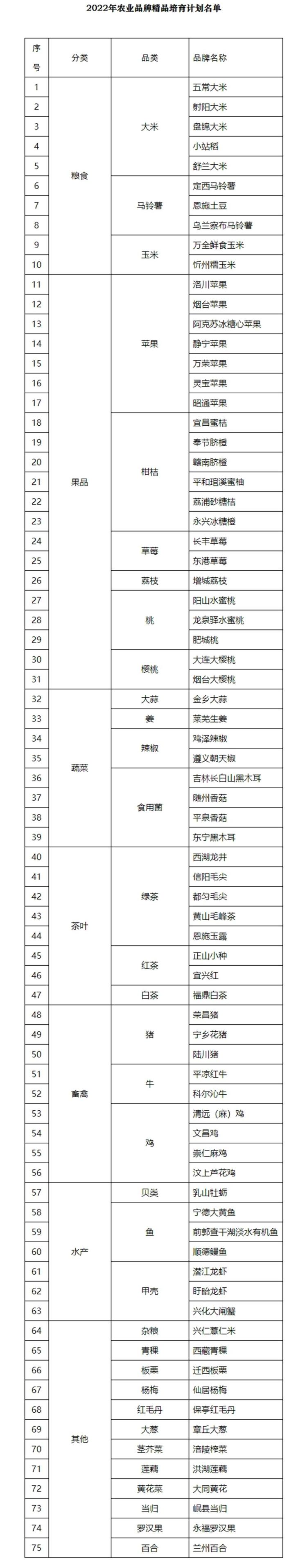 按照《农业农村部办公厅关于开展2022年农业品牌精品培育工作的通知》要求,经省级推荐、形式审查、专家推选等程序,共有75个农业品牌纳入2022年农业品牌精品培育计划,现予以公示,公示期为5个工作日。如有异议,请在公示期内(以材料寄出邮戳时间为准)以书面(实名)形式反馈农业农村部市场与信息司和农业农村部农产品质量安全中心。