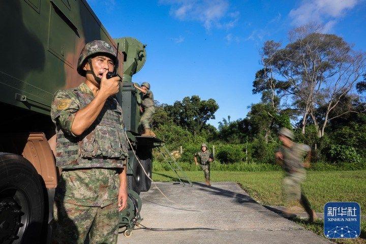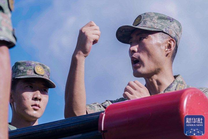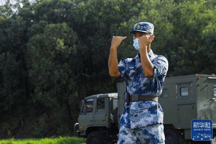 驻香港部队某团防空营营长王海旭在防空阵地上指挥战斗装备进入预定区域(2020年8月13日摄)。新华社发(田越洋 摄)