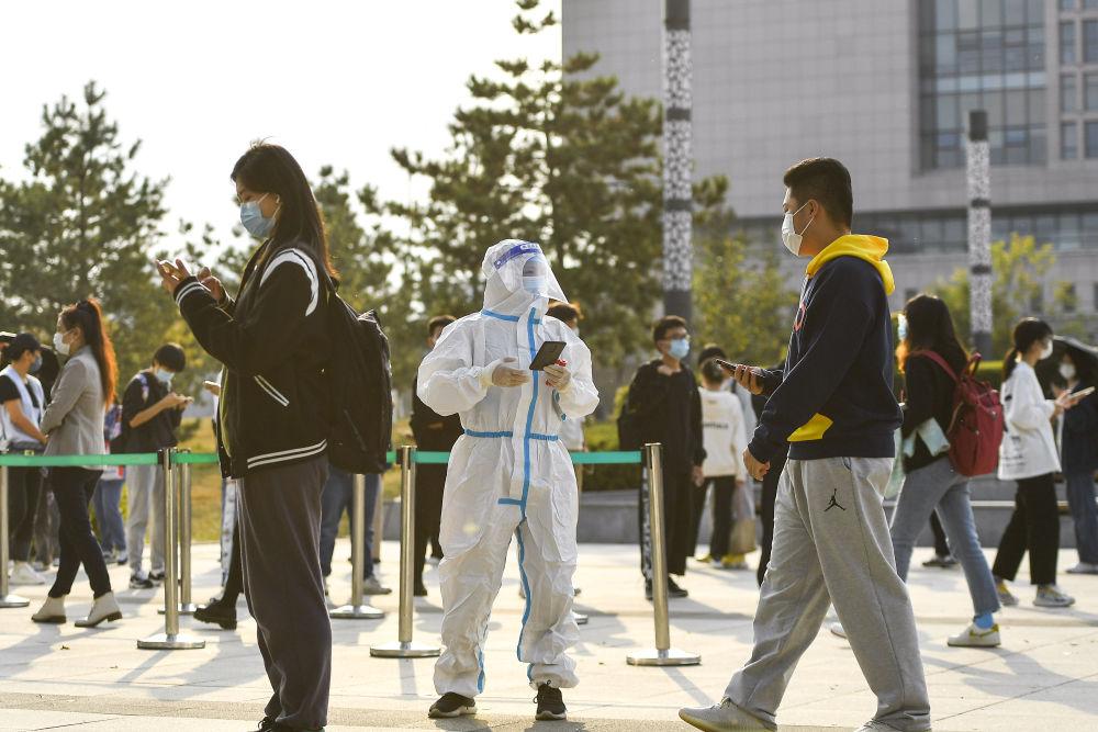 10月2日,在吉林省长春市一处便民核酸检测点,工作人员为前来进行核酸检测的市民扫码登记。新华社记者 许畅 摄
