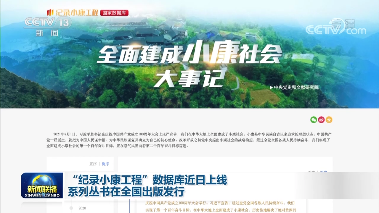央视网消息(新闻联播):“纪录小康工程”数据库近日上线,系列丛书在全国出版发行。