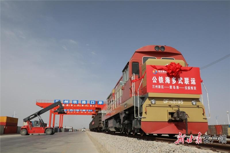 抢抓共建“一带一路”机遇,内外兼顾、陆海联动、向西为主、多向并进的开放新格局加快形成。图为2020年4月16日,首班兰州新区-黄岛港-拉脱维亚公铁海多式联运开通。