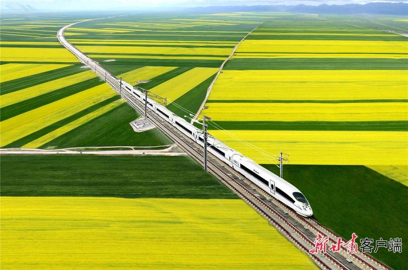 深入实施西部大开发战略,强化基础设施规划建设,交通、水利、新基建等一大批标志性工程建成投运。图为兰新高铁甘肃省张掖市民乐段。