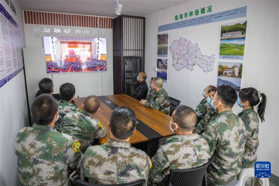 10月16日,浙江省台州临海市林场职工在位于括苍山的林场内收看中国共产党第二十次全国代表大会开幕会。