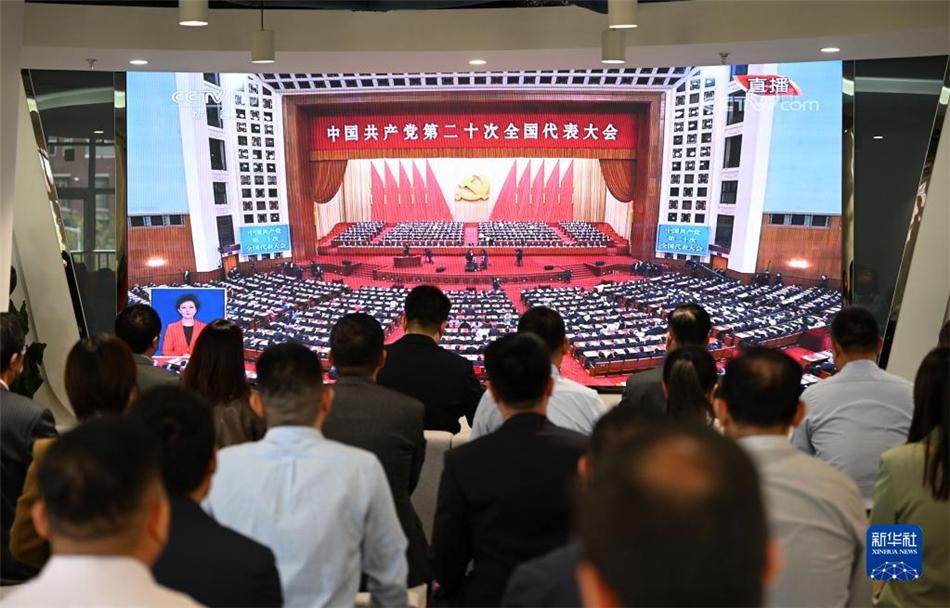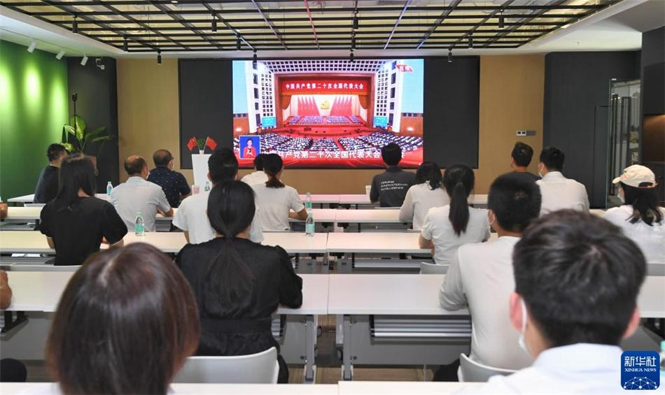 10月16日,在广东省深圳市前海深港青年梦工场北区,在前海工作的青年收看中国共产党第二十次全国代表大会开幕会。