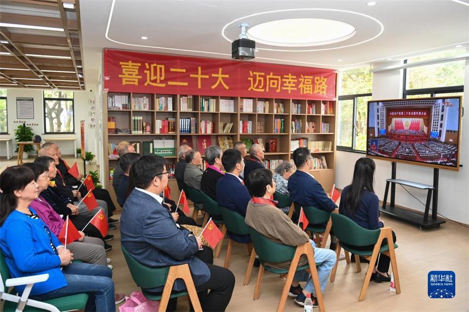 10月16日,在湖南省湘西土家族苗族自治州花垣县双龙镇十八洞村,村民在收看中国共产党第二十次全国代表大会开幕会。