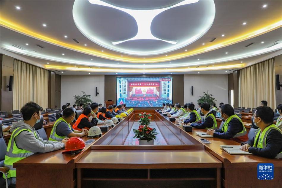10月16日,在重庆江北国际机场T3B航站楼项目部,中建八局西南公司一线职工收看中国共产党第二十次全国代表大会开幕会。