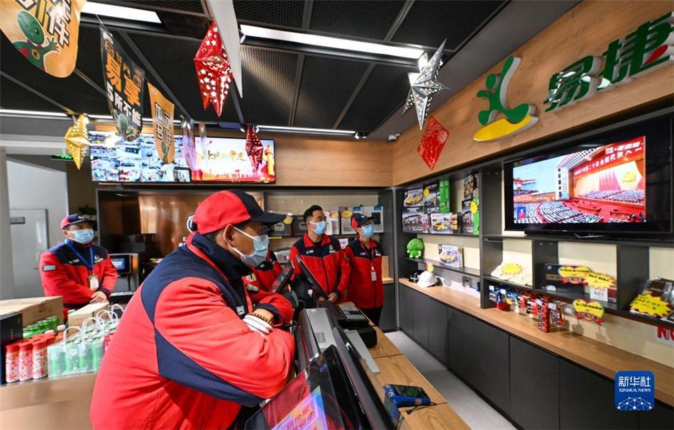 10月16日,在位于天津市南开区的中国石化销售股份有限公司天津石油分公司长江道加油站,工作人员在工作间隙观看开幕会直播。