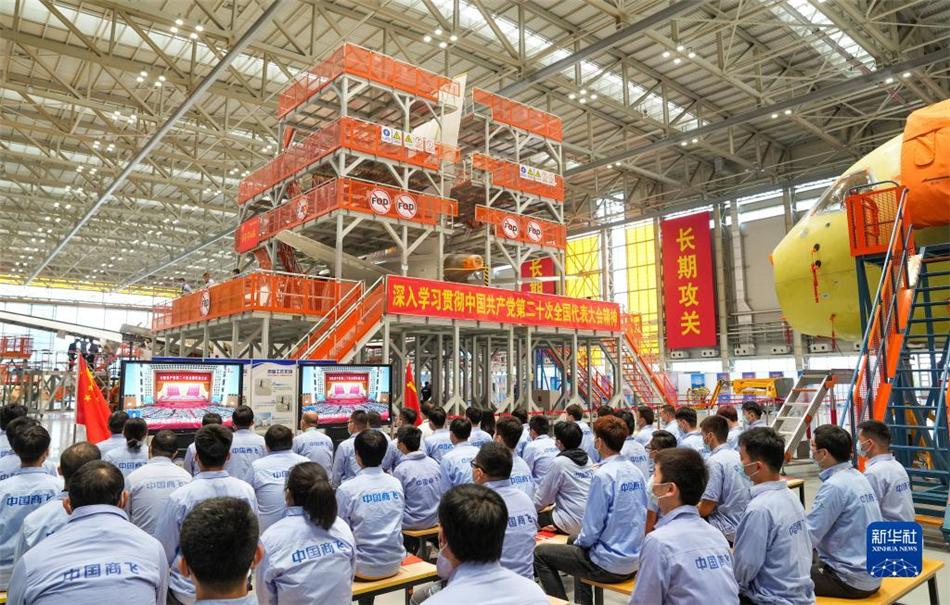 10月16日,在中国商飞上海飞机制造有限公司总装车间,员工们在收看中国共产党第二十次全国代表大会开幕会。新华社记者 丁汀 摄