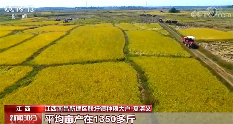 江西南昌新建区联圩镇种粮大户 夏清义:一方面采用了全程机械化服务,另一方面采用了微生物缓释技术,所以今年的中稻产量比较高,平均亩产在1350多斤,最高产量达到了1700多斤。