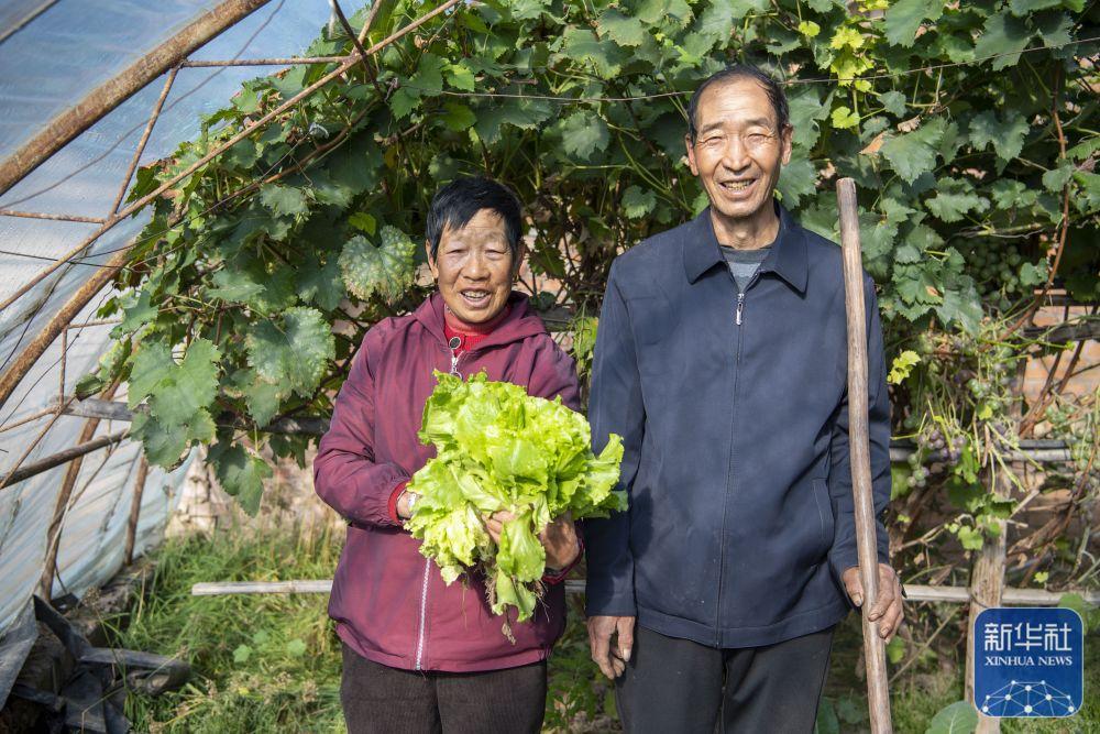 10月16日,在山西省岢岚县宋家沟村,村民周有娥(左)和老伴在自家大棚里合影。新华社记者 杨晨光 摄