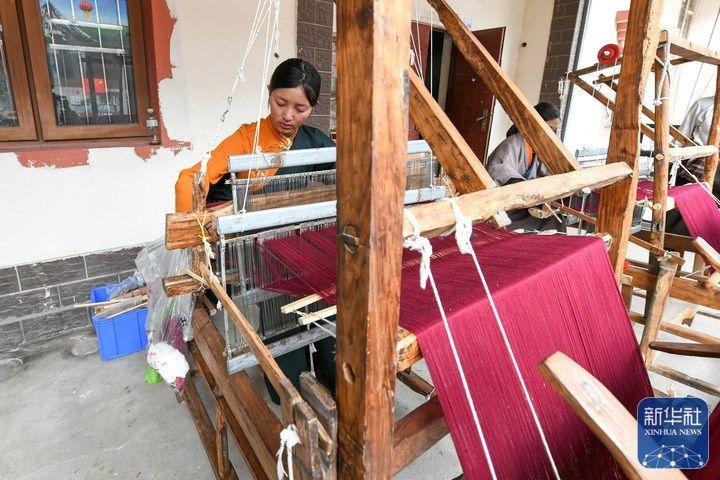 10月16日,在四川阿坝汶川县映秀镇渔子溪村,织工在纺织牦牛绒披肩。新华社记者 唐文豪 摄