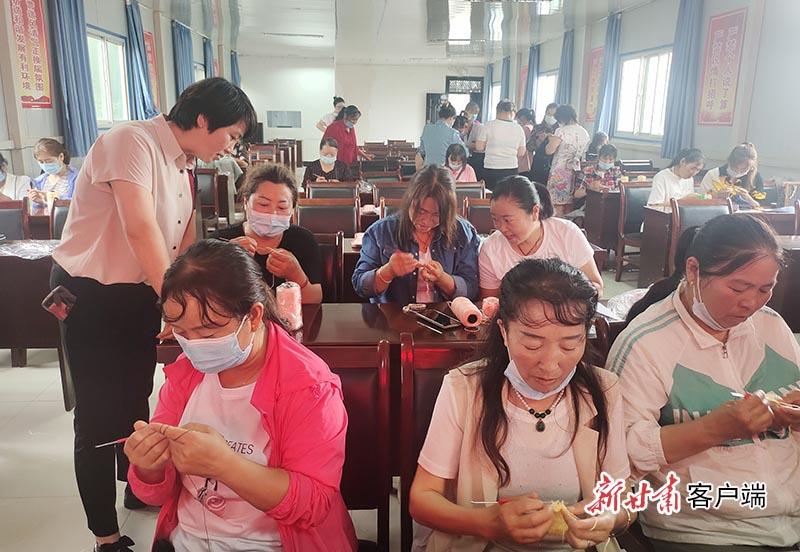岳彩霞培训妇女手工钩编技能。