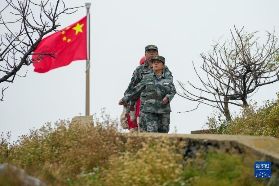 10月16日,在江苏省连云港市灌云县开山岛,王仕花(前)、轮值民兵和江苏电力开山岛党员服务队队员在岛上巡逻。新华社记者 李博 摄