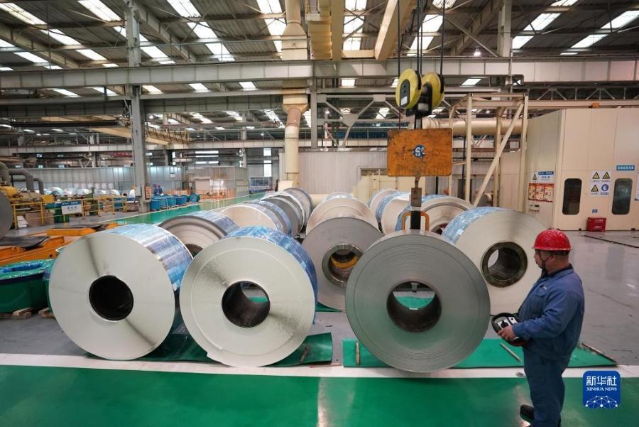 山西太原,中国宝武山西太钢不锈钢精密带钢有限公司车间,生产线上机器轰鸣,一卷卷薄如蝉翼、光滑如镜的钢材经过压延、清洗、包装等步骤自动化制成。