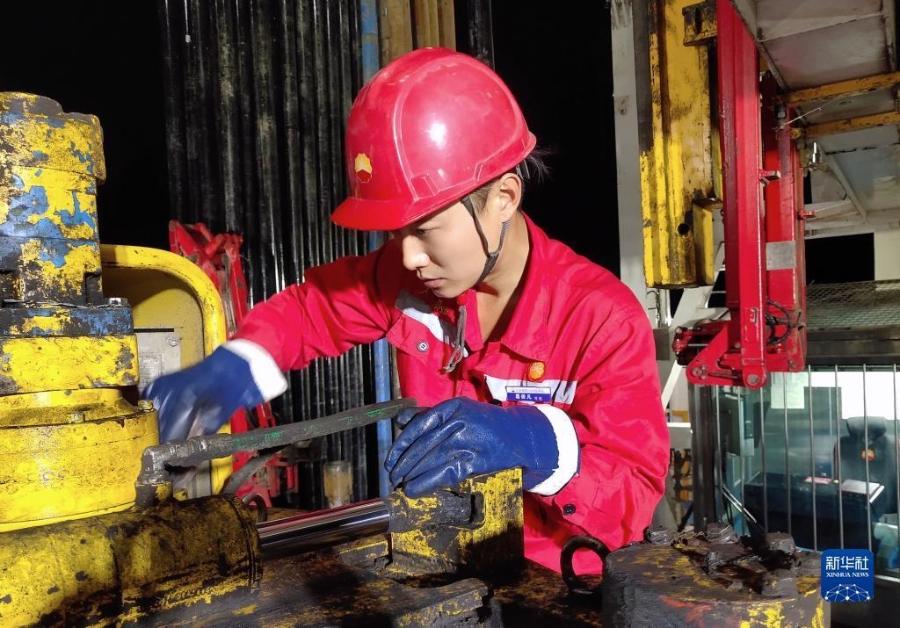 10月17日,黑龙江大庆油田1205钻井队青年员工葛依凡在作业中。新华社发(段永坚 摄)