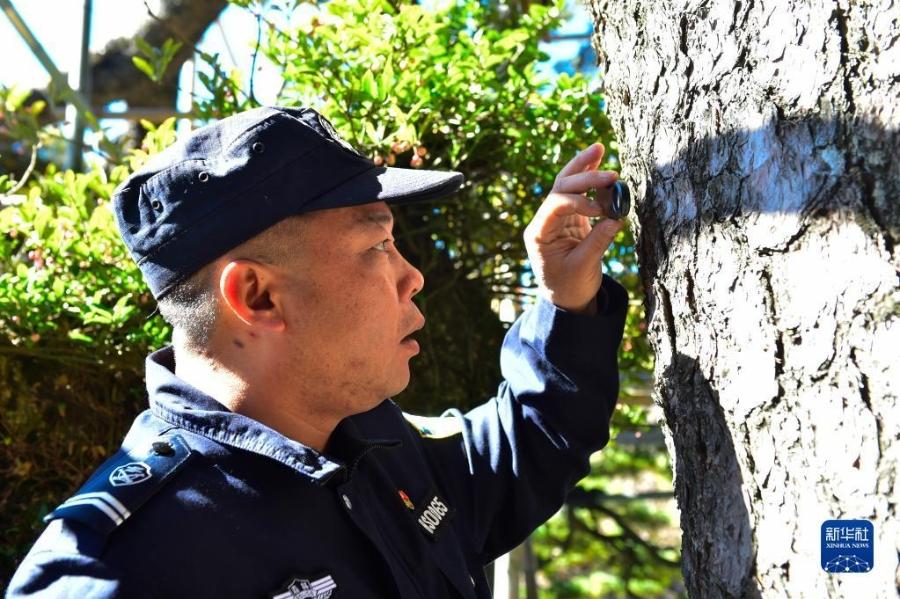 10月16日,安徽黄山守松人胡晓春用放大镜检查迎客松的树皮和纹理。新华社发(蔡季安 摄)