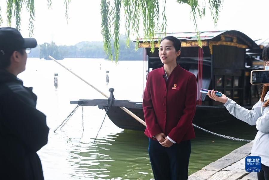 10月16日,在浙江省嘉兴市,南湖革命纪念馆讲解员张一在接受采访。新华社记者 徐昱 摄