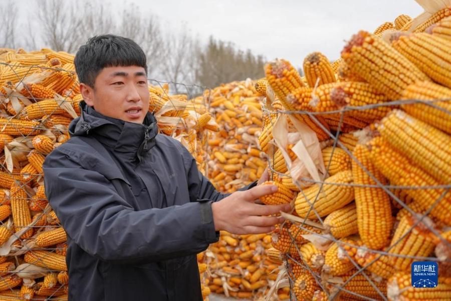 10月17日,在吉林省梨树县梨树镇八里庙村一家农机农民专业合作社,负责人马云秋在整理玉米。新华社发(程禹然 摄)