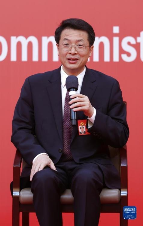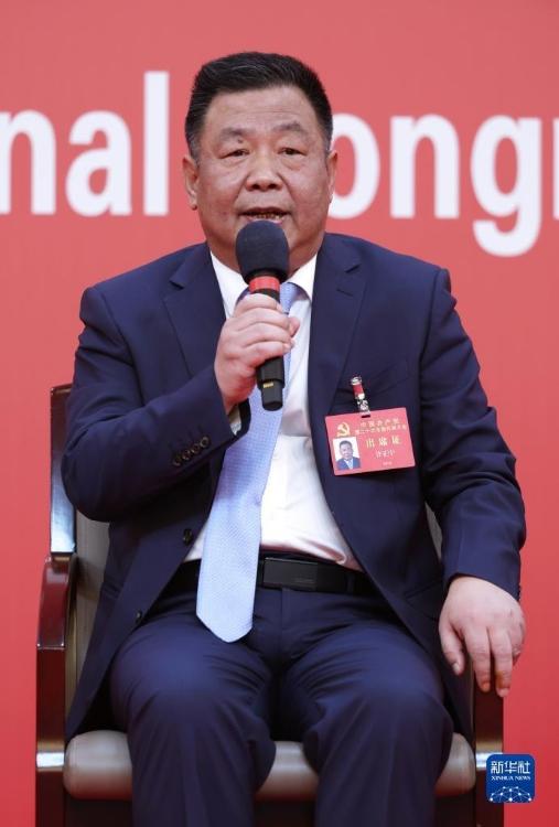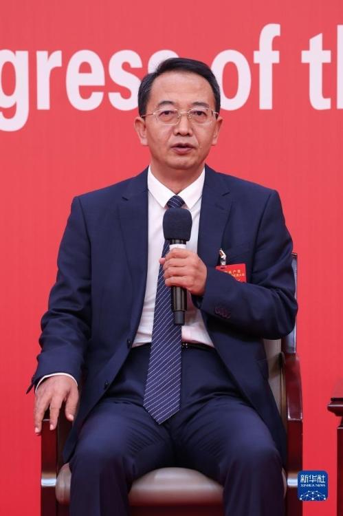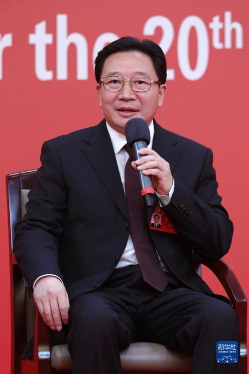 10月19日,中国共产党第二十次全国代表大会新闻中心举行集体采访。山东、河南、湖北、湖南、广东、广西、海南代表团新闻发言人出席,介绍代表团学习讨论二十大报告情况,并回答记者提问。新华社记者 陈建力 摄