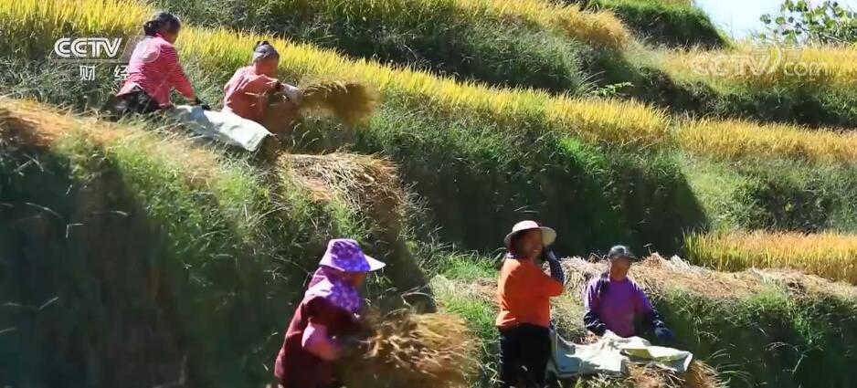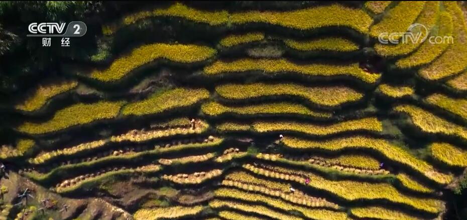 总台记者 孙佳音:我现在是在江西省赣州市崇义县的上堡梯田。大家通过镜头可以看到这里的一大片梯田,稻子已经丰收,在阳光的照射下闪着金黄色,当地的村民也正在这里的田里忙着收割、打捆、搬运稻谷。