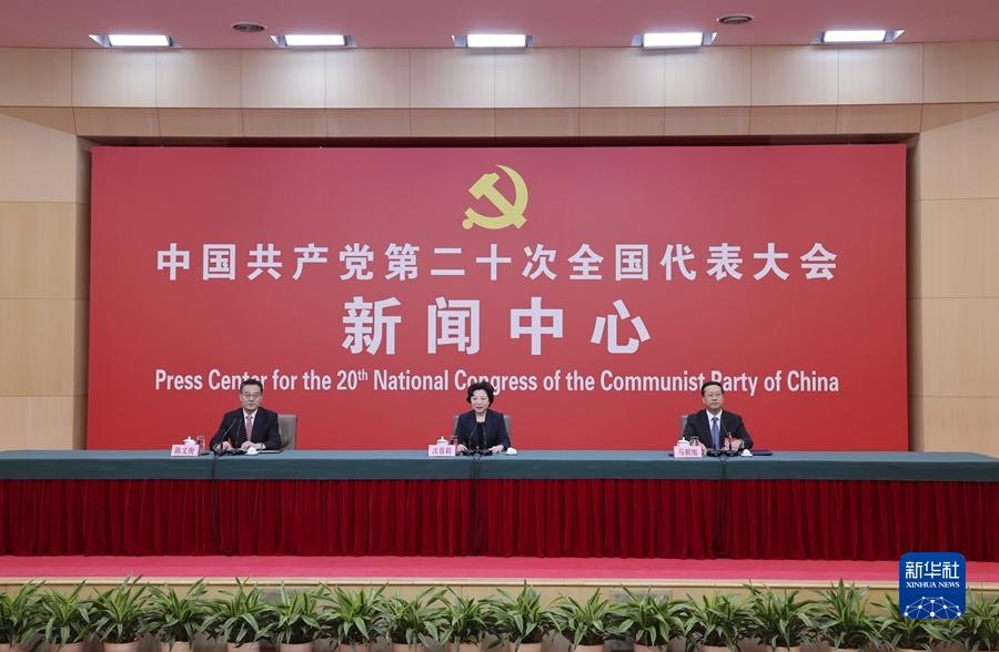 10月20日,中国共产党第二十次全国代表大会新闻中心举行记者招待会。中央对外联络部副部长沈蓓莉,外交部党委委员、副部长马朝旭围绕“习近平外交思想指引中国特色大国外交开拓前行”主题与记者交流。新华社记者 张玉薇 摄
