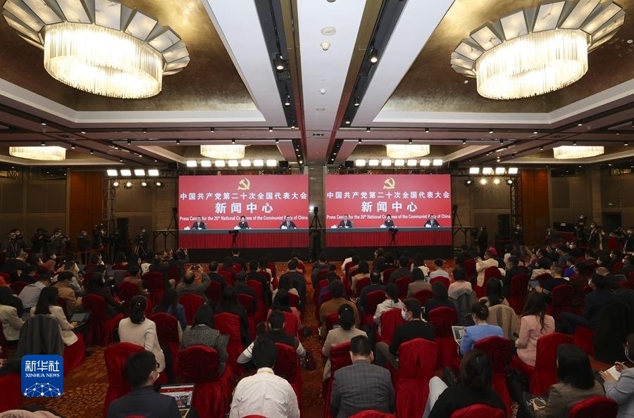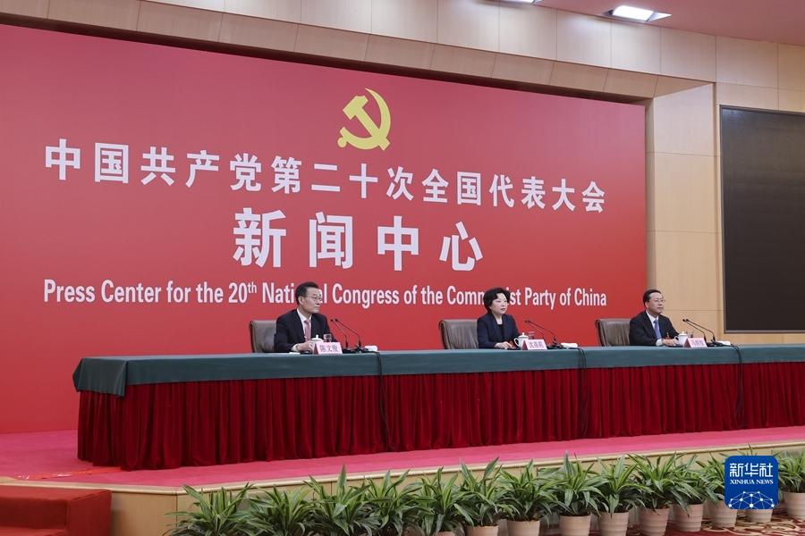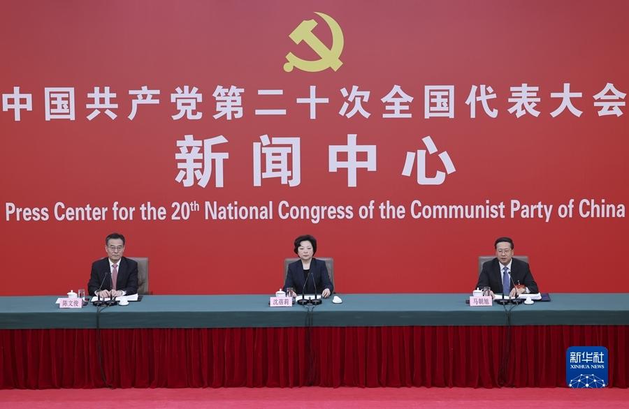 10月20日,中国共产党第二十次全国代表大会新闻中心举行记者招待会。中央对外联络部副部长沈蓓莉,外交部党委委员、副部长马朝旭围绕“习近平外交思想指引中国特色大国外交开拓前行”主题与记者交流。新华社记者 陈建力 摄