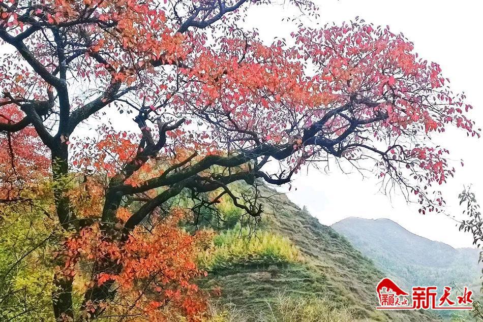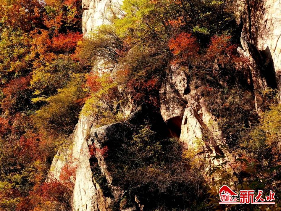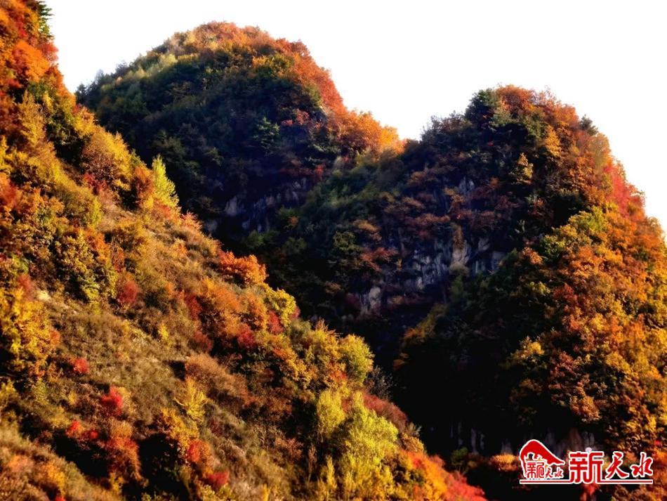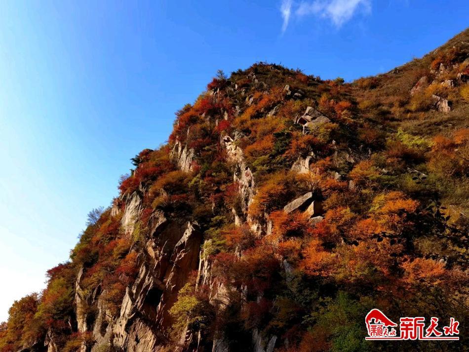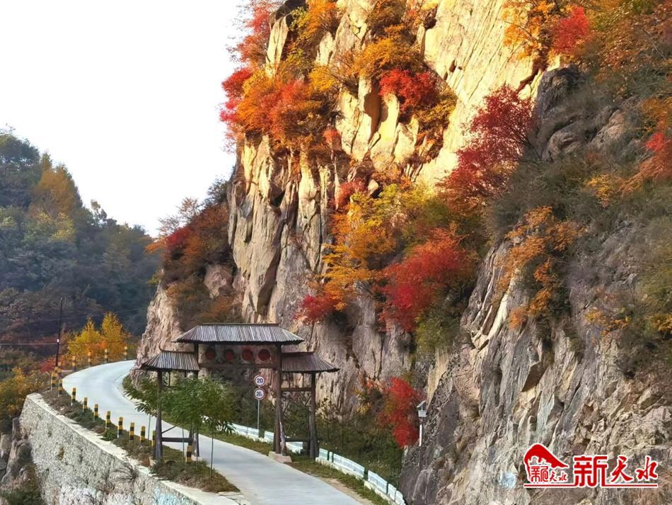 棋盘峡口涓涓细流顺山而下,火红的枫叶与悬挂于峡口的青松翠柏相互点缀,树木各呈色彩,漫山遍野的秋色,倏忽间人在画中。