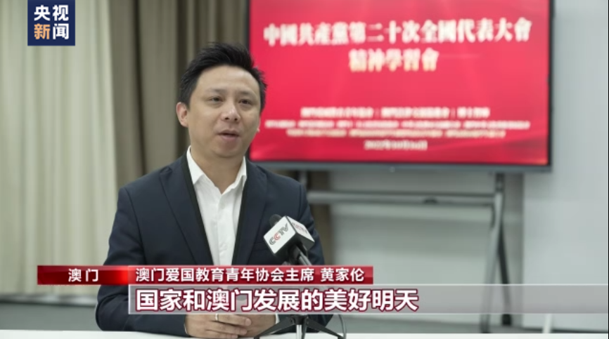 澳门爱国教育青年协会主席 黄家伦:听了习近平总书记的报告后,大家的心情都特别激动,也非常受鼓舞。报告不仅展示了国家和澳门发展的美好明天,也将为港澳青年施展才华开辟更广阔的天地。作为澳门青年,我觉得要立志民族复兴,一方面要传承好爱国爱澳的优良传统,同时也要把个人成长和贡献国家紧密联系在一起。
