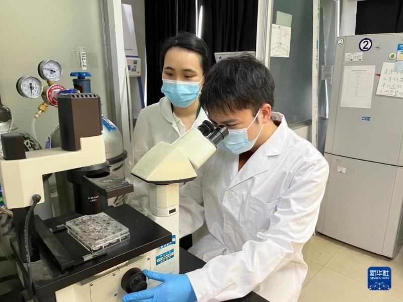 ▲10月20日,广东中山大学中山医学院博士研究生张贤涛(右)在实验室。新华社发