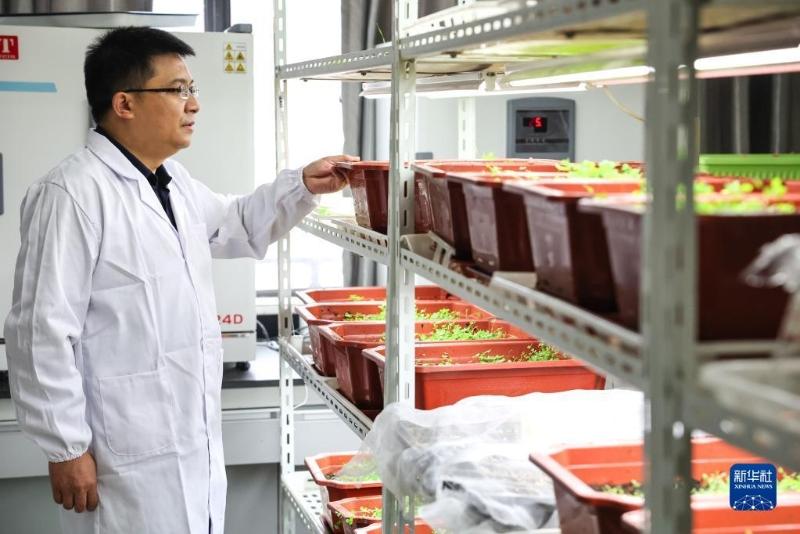 ▲10月20日,贵州大学动物科学学院院长陈超在实验室内观察新品种牧草的生长情况。新华社记者 欧东衢 摄