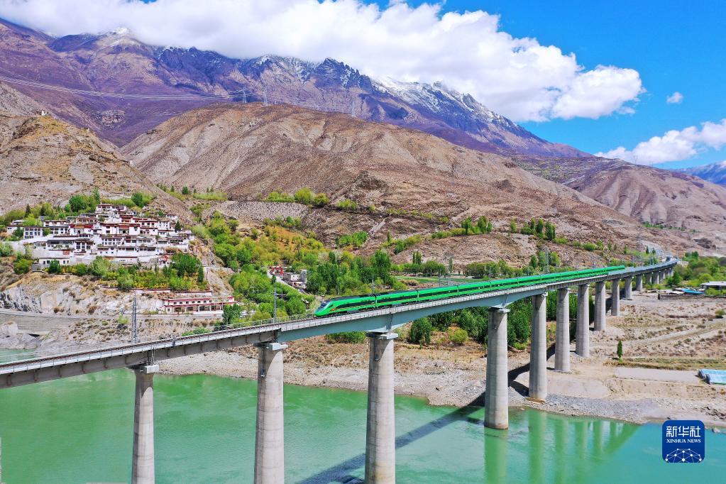 复兴号列车行驶在西藏朗县境内(2022年4月14日摄)。新华社记者 觉果 摄