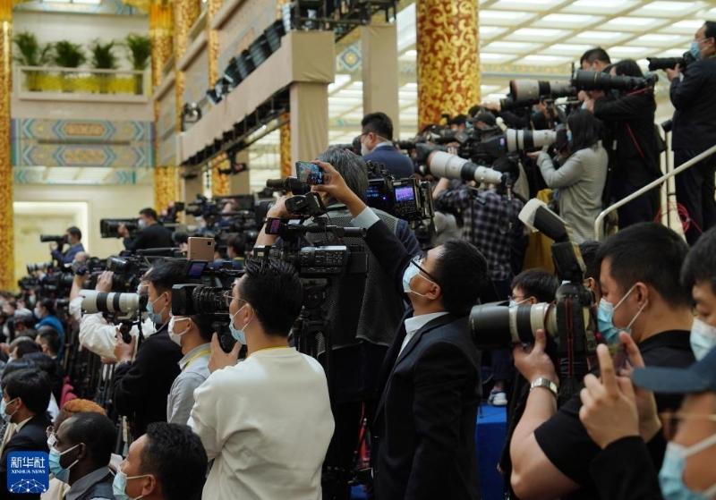 10月23日,中外记者在北京人民大会堂报道新一届中共中央政治局常委首次集体亮相。新华社记者 才扬 摄