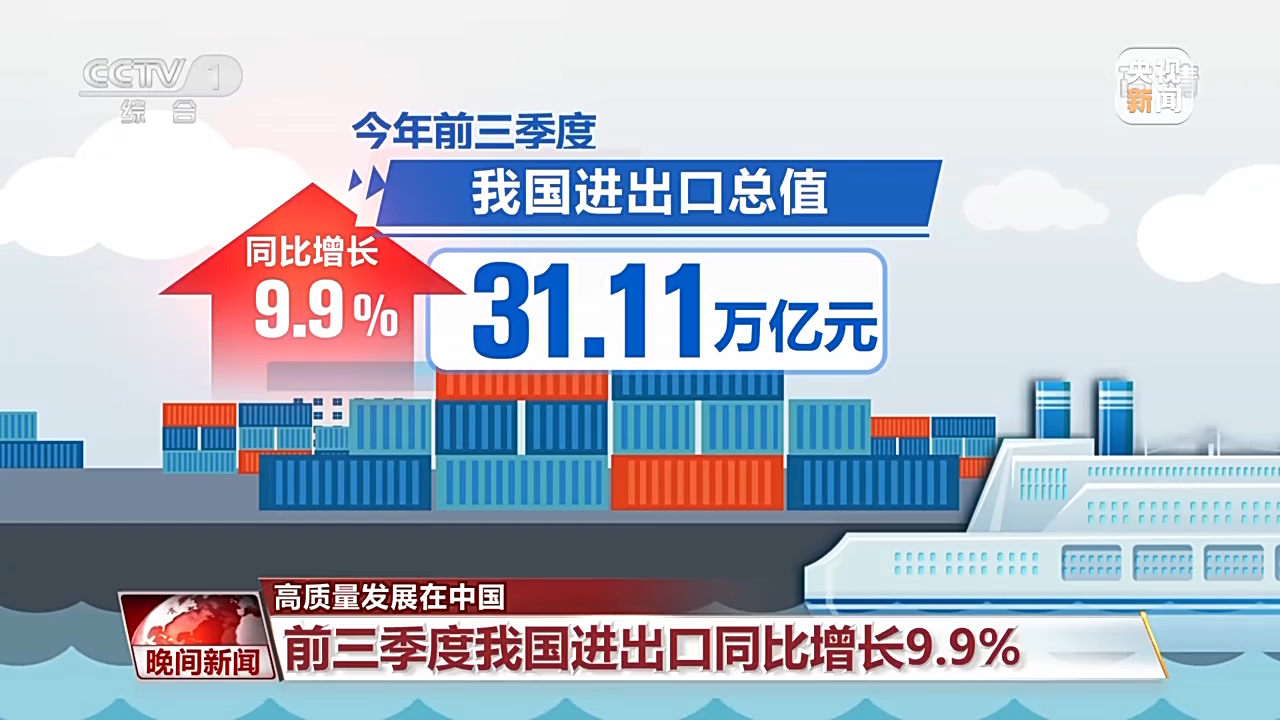 海关总署今天公布,今年前三季度,我国进出口总值31.11万亿元,同比增长9.9%。其中,出口17.67万亿元,增长13.8%;进口13.44万亿元,增长5.2%。前三季度,我国对东盟、欧盟、美国和韩国分别进出口4.7万亿元、4.23万亿元、3.8万亿元和1.81万亿元,同比分别增长15.2%、9%、8%和7.1%。同期,我国对“一带一路”沿线国家合计进出口10.04万亿元,增长20.7%。
