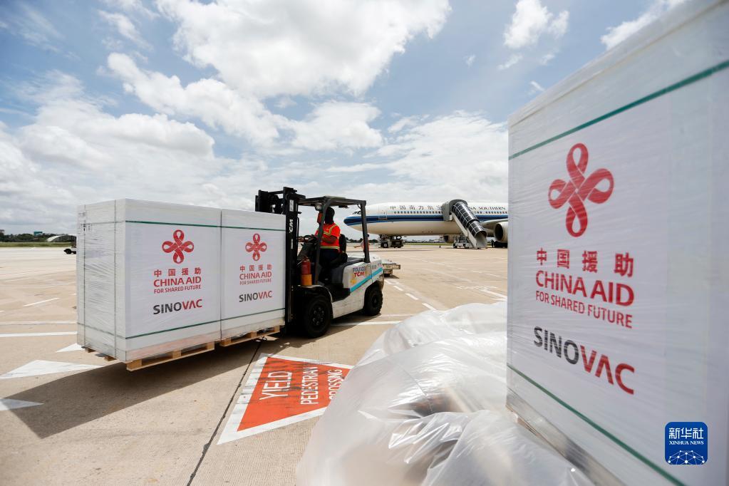 工作人员在柬埔寨金边国际机场运输中国政府援助柬埔寨的科兴新冠疫苗(2021年10月14日摄)。新华社发(批隆 摄)