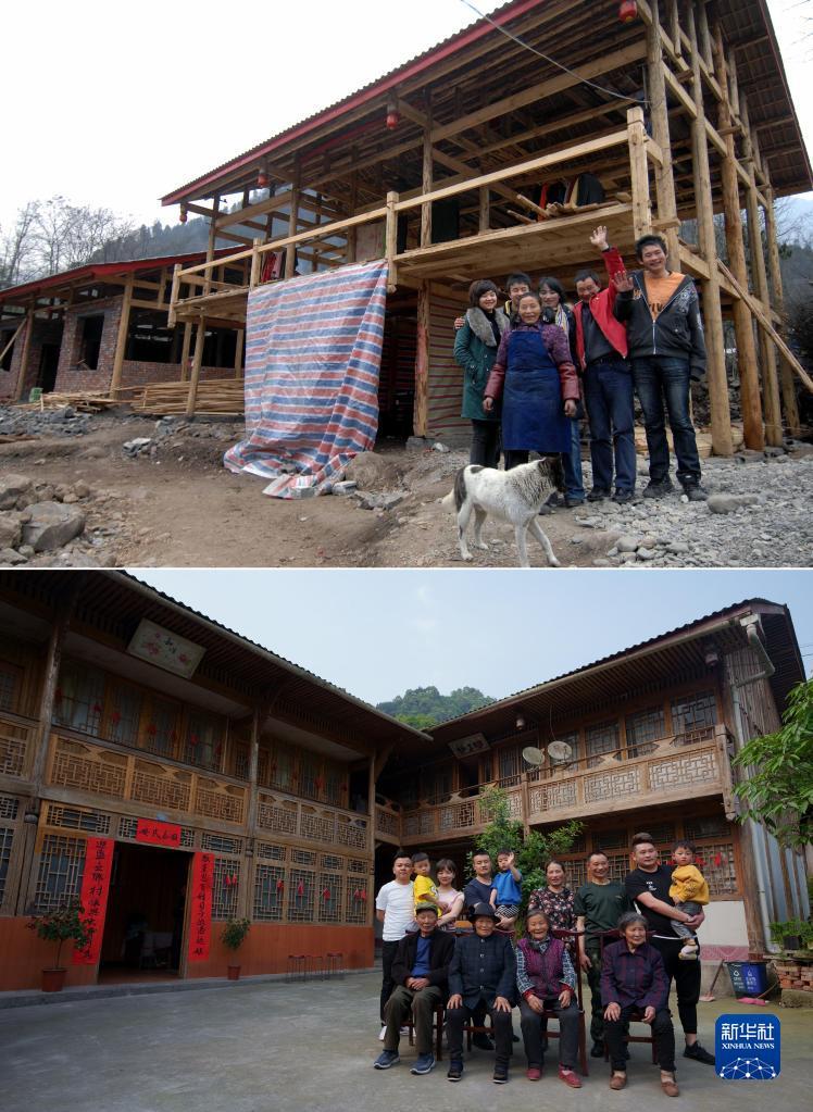 这是一张拼版照片,上图为四川省绵阳市安州区高川乡茅香村群众林兴聪(右二)、李芸香(右三)和家中的老人、孩子在重建中的住房前留影(2009年1月25日,新华社记者江毅摄);下图为林兴聪(后右三)、李芸香(后右四)一大家13口人在房前留影(2021年5月4日,新华社记者江宏景摄)。新华社发