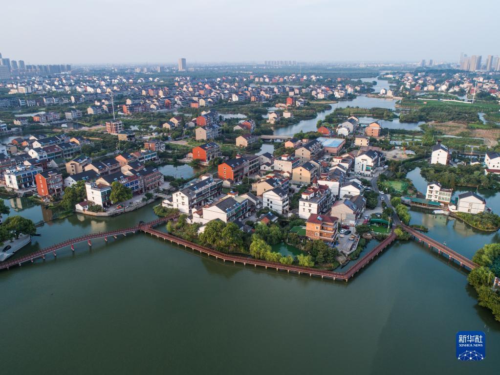 空中俯瞰杭州市余杭区塘栖古镇丁山湖边的水上栈道和丁河村(2019年8月7日摄,无人机照片)。新华社记者 徐昱 摄