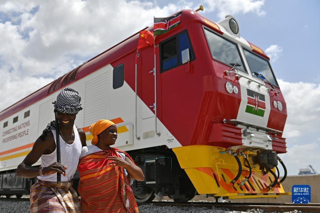 在肯尼亚蒙巴萨,当地民众在中国承制的蒙内铁路首批内燃机车旁载歌载舞(2017年1月11日摄)。新华社记者 孙瑞博 摄