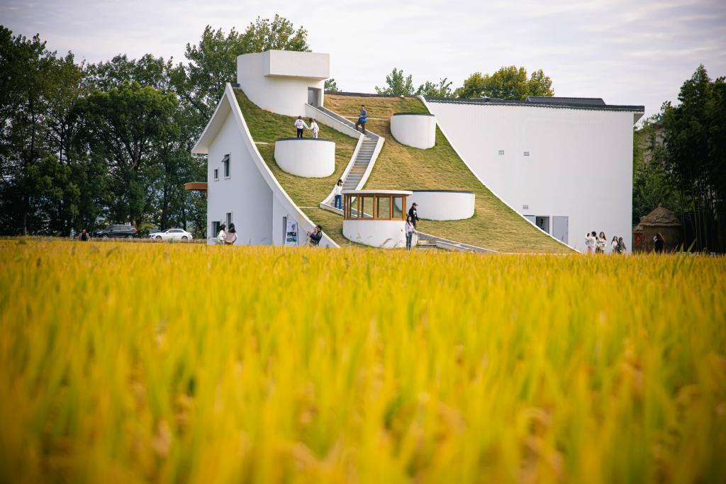 榨油厂改造成乡村会客厅,游客站在铺满草坪的屋顶观赏台上,秋日稻田尽收眼底,稻香里还能寻到一丝咖啡香气。经过前期招商落地的咖啡馆,从国庆假期至今,人气一直不减。