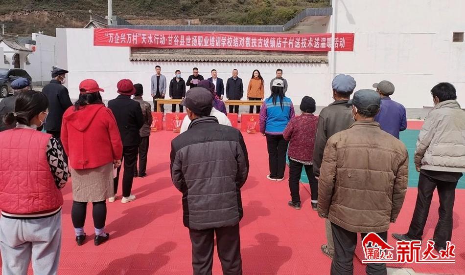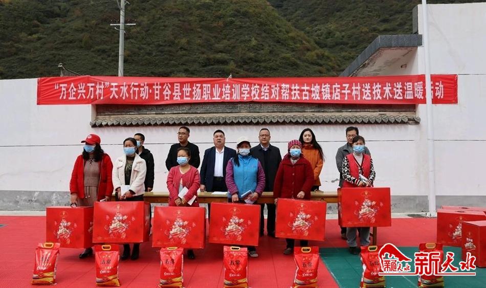 新天水讯 10月25日,甘谷县世扬职业培训学校到结对帮扶点古坡镇下店子村开展“万企兴万村,送技术送温暖”活动,给帮扶群众送去了实用农业技术以及大米、棉被等物资,切实发挥企业优势为民办实事,助力乡村振兴。
