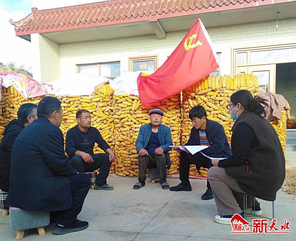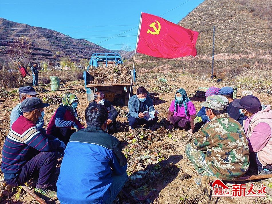 10月31日,在榆盘镇钟楼村老党员李旺平家的庭院里,支部书记和党员群众围坐在一起,李旺平用通俗易懂的语言,为大家领学党的二十大精神,鼓励乡亲们坚定发展信心,一心一意跟党走,共行致富路。
