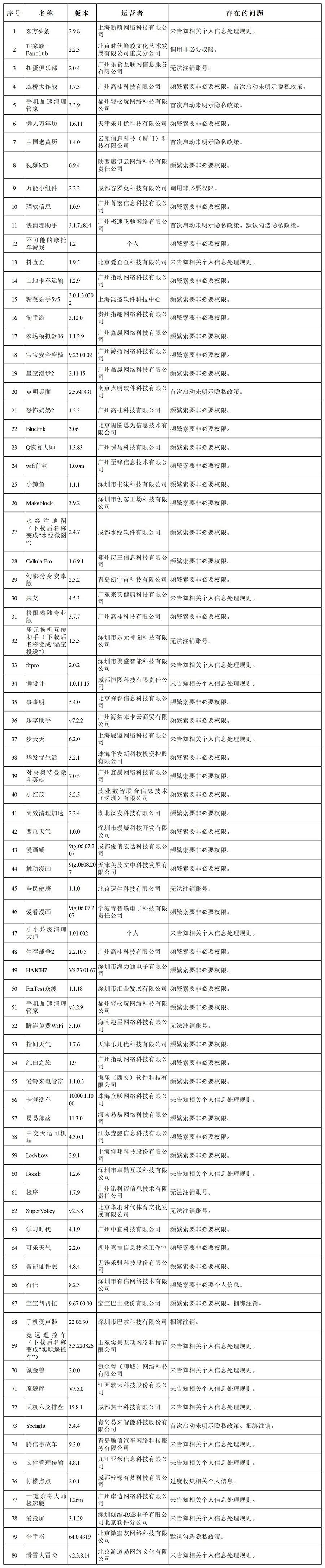 经查,“超凡清理管家”等55款App存在强制索要非必要权限、未经单独同意向第三方共享精确位置信息、无隐私政策、超范围收集上传通讯录等问题,违反《个人信息保护法》等法律法规规定,性质恶劣,依法予以下架处置;“东方头条”等80款App存在频繁索要非必要权限、首次启动未提示隐私政策、未告知相关个人信息处理规则、默认勾选隐私政策、无法或难以注销账号等问题,违反《个人信息保护法》等法律法规规定,依法责令限期1个月完成整改,逾期未完成整改的,依法予以下架处置。