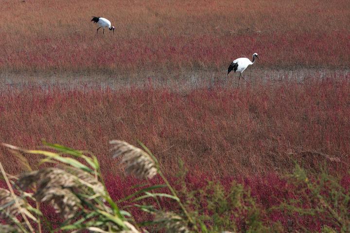 在位于盘锦的辽河三角洲湿地包括芦苇沼泽、浅海海域、河流库塘、水稻田等湿地类型。特殊环境孕育出的碱蓬草铺满滩涂,一到秋天这里就成了“红色海岸线”。新华社记者王乙杰摄