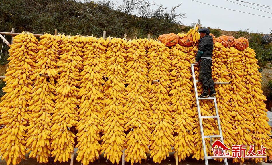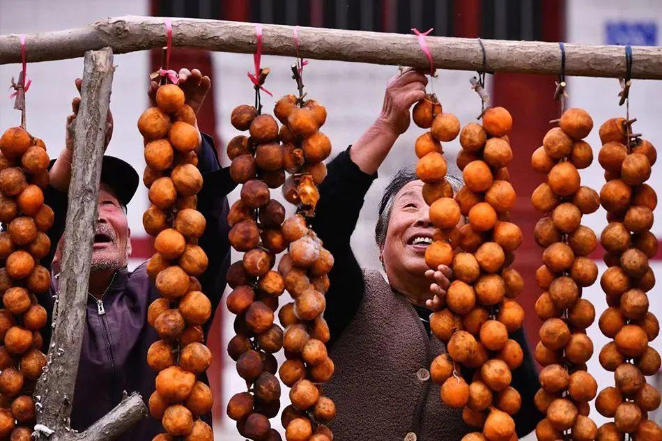 在麦积区甘泉镇大江沟村,村民满脸喜悦将柿子挂竹架上晾晒。(黄斌 摄)