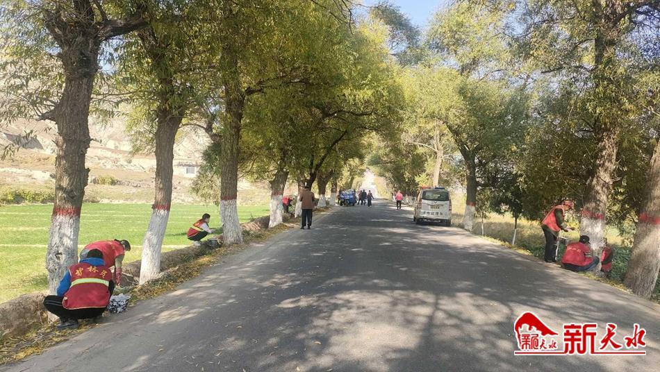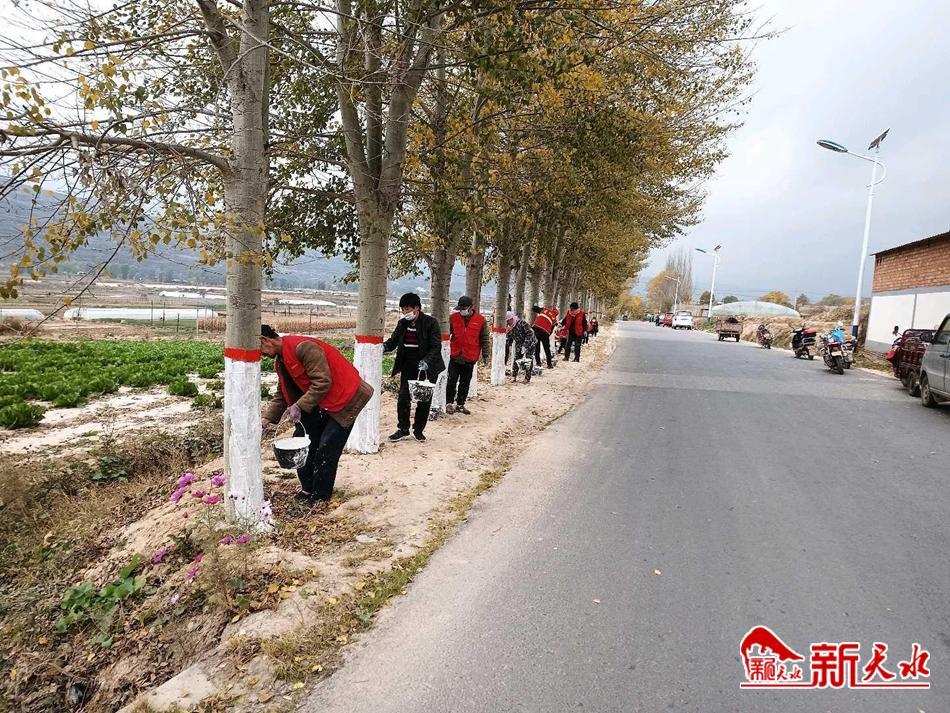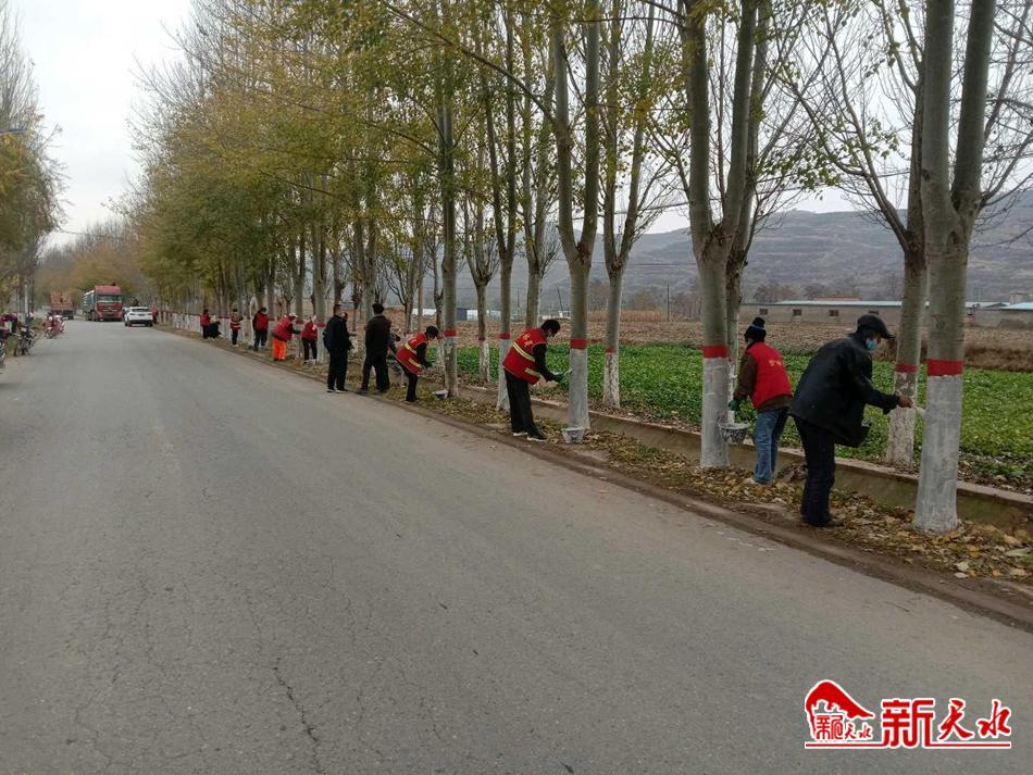 新天水讯 近期,武山县马力镇组织护林员对镇内的行道树刷白,增强树木抗寒防冻防虫能力,确保树木安全过冬。