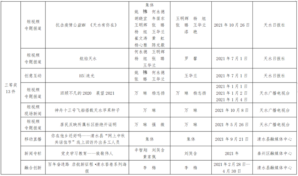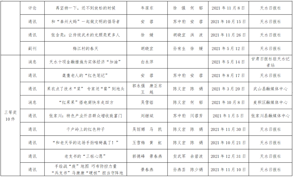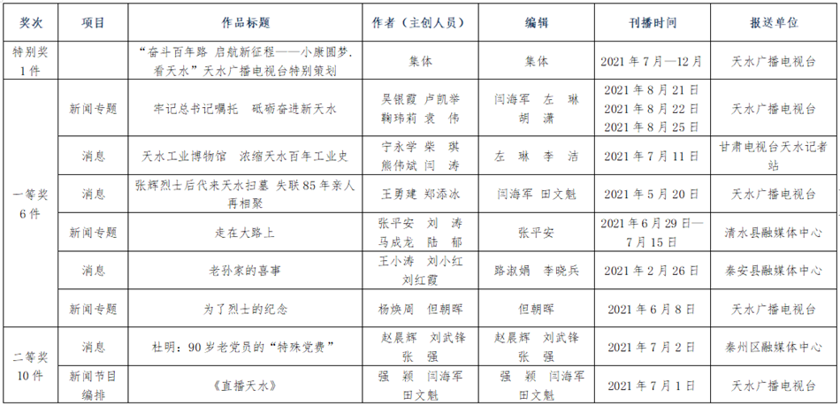 为充分发挥优秀新闻作品示范引领作用,经各新闻单位推荐,天水市新闻奖评委会认真评审,评选出97件作品为第二十五届(2021年度)天水市新闻奖获奖作品(其中,特别奖2件,一等奖18件,二等奖31件,三等奖46件)。