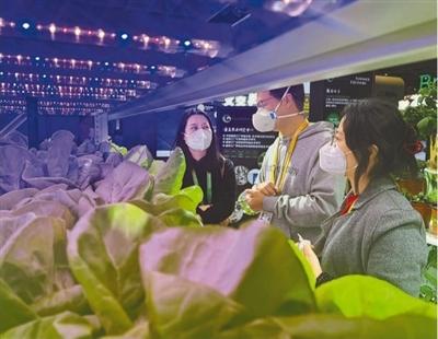 进博会食品及农产品展区,工作人员向观众讲解“垂直农场”生产系统。