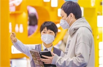 进博会食品及农产品展区,工作人员为观众提供观展服务。