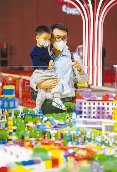 进博会消费品展区,小朋友被乐高玩具深深吸引。