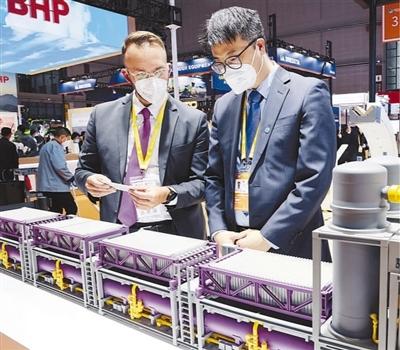 进博会能源低碳及环保技术专区蒂森克虏伯展台,工作人员在介绍碱水电解制氢模块。